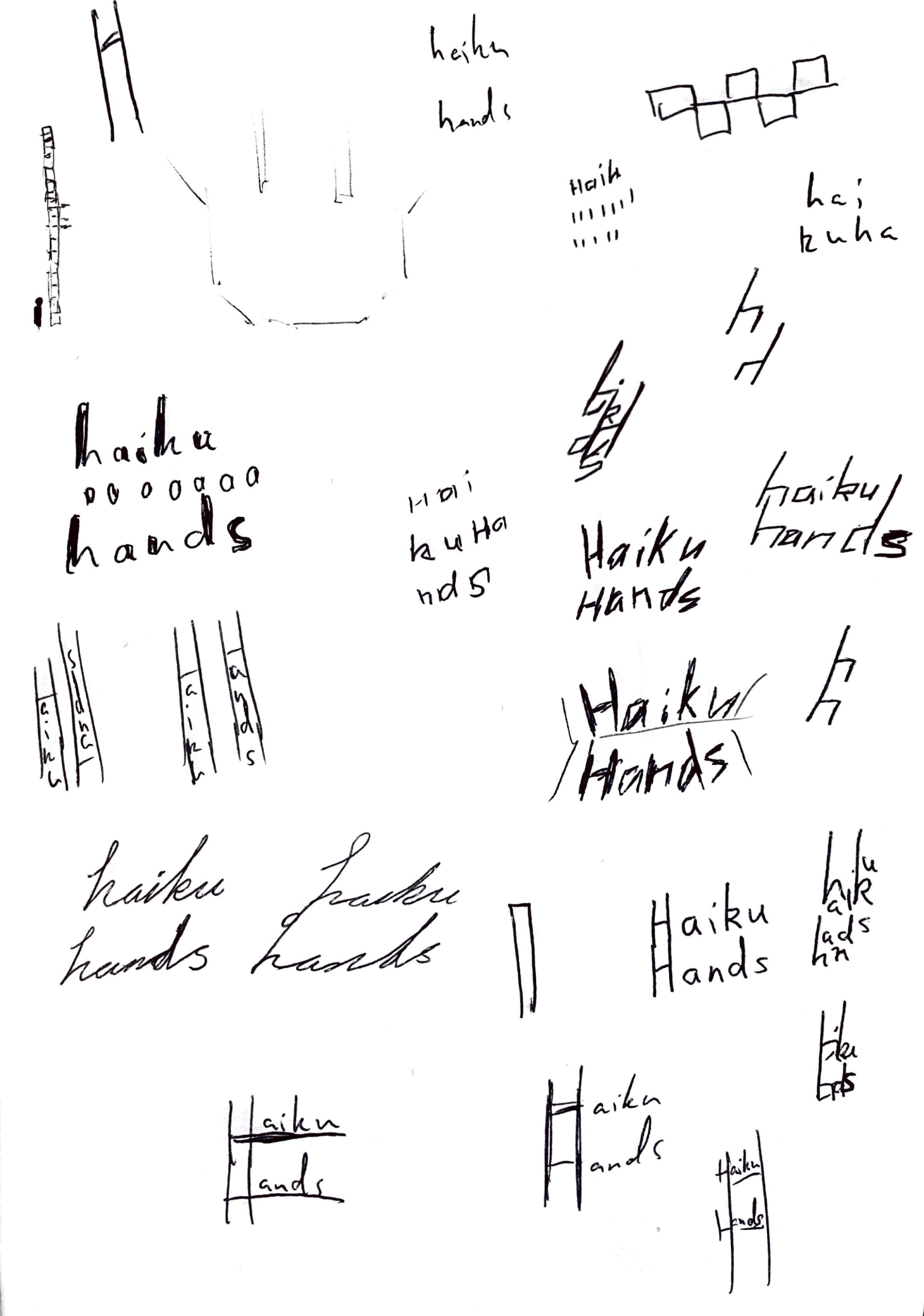 In the initial stages of development, one concept was centred on a literal representation of hands, with the idea that such a logo would be replicable by audience members, breaking down the barriers between Haiku Hands and their fans. Later stages of development focused on a more typographical/street art style of identity.
